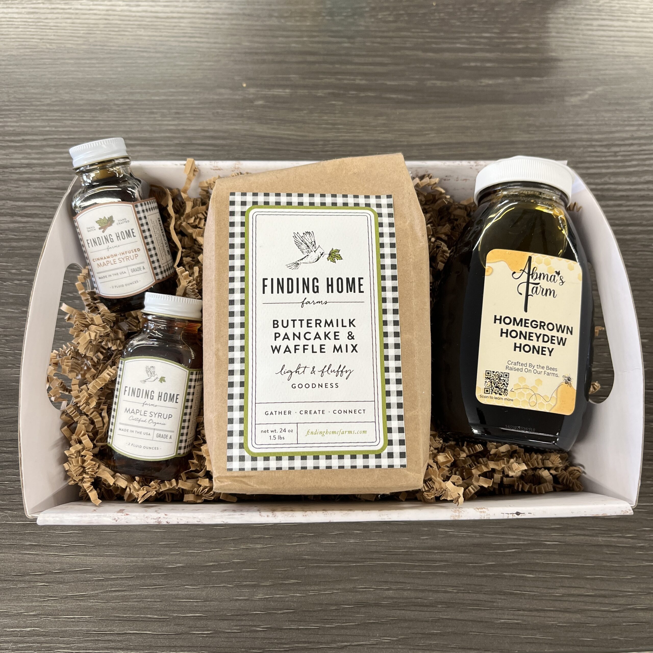 Bundle includes Finding Home Farms pancake and waffle mix, two mini syrups, and 1lb. jar of Abma's Farm homegrown raw honey. Pick up in Wyckoff, NJ.