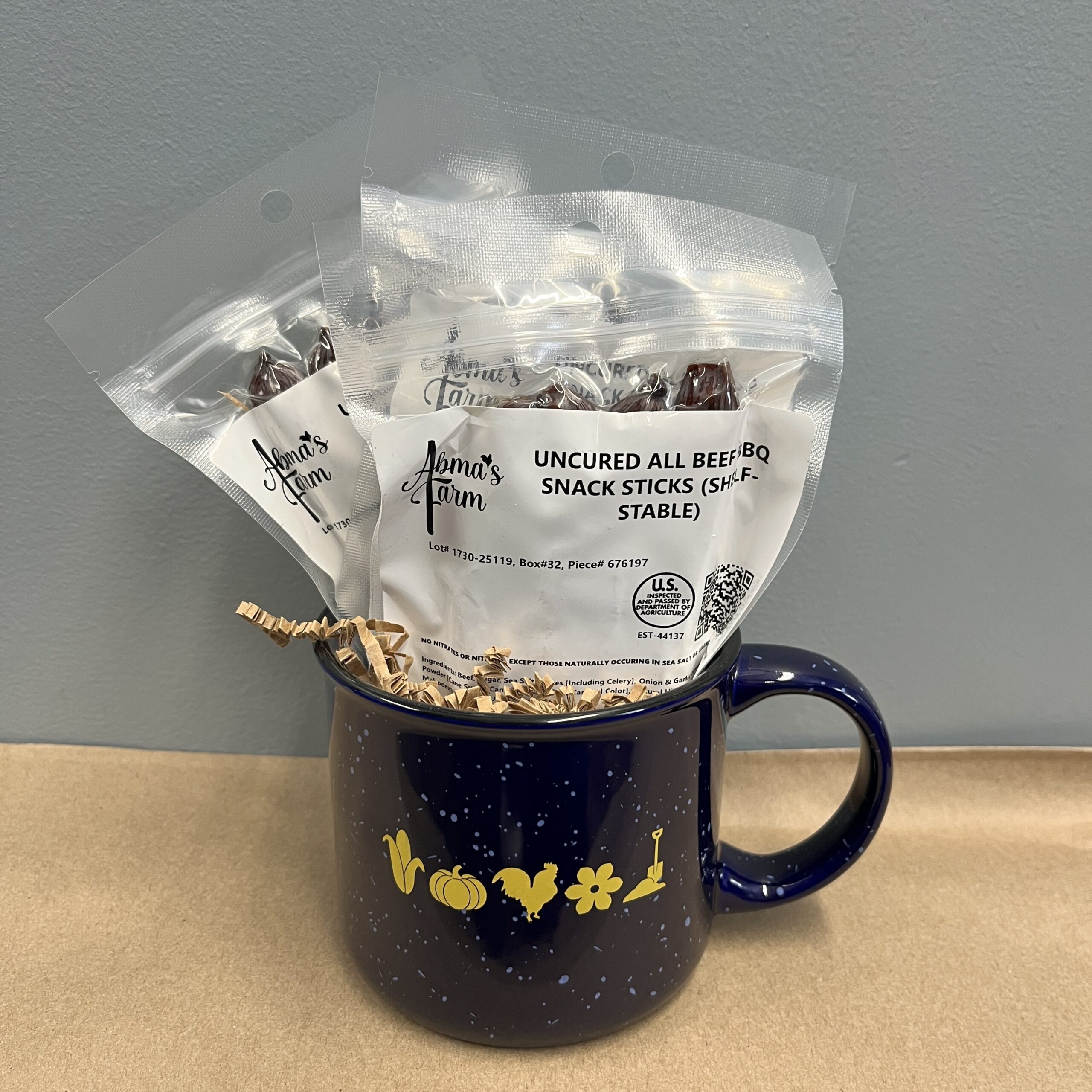 Bundle includes Abma's Farm mug, two varieties of Abma's homegrown meat snack sticks, and one variety of Abma's homegrown jerky. Pick up in Wyckoff, NJ.